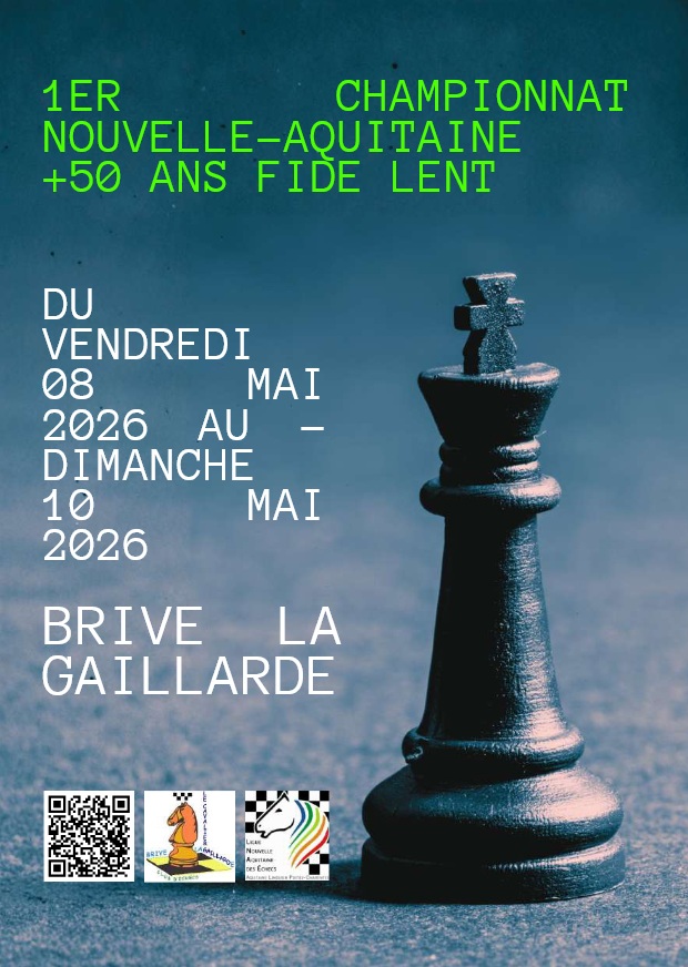 Championnat de Nouvelle Aquitaine des plus de cinquante ans : le week-end des 8, 9 et 10 mai 2026, en partenariat avec le GMI Mr Eric Prié, le club de Brive propose le 1er championnat de Nouvelle Aquitaine, homologué Fide à cadence lente, pour les joueur(euse)s agé(e)s de plus de 50 ans (catégorie "Seniors plus et vétérans").Afin de satisfaire aussi les plus jeunes, nous ouvrons deux tournois supplémentaire, fermés (A et B) de même cadence.Pour les non affiliés, la licence A obligatoire est délivrée sur place.Pour prendre connaissance des informations utiles et vous inscrire, veuillez scanner le QR code présent sur l'affiche du championnat.Le cas échéant, pour répondre à votre souhait d'hébergement à Brive, je vous propose (à prix modéré) l'hôtel Abelha Le France au 60 avenue Jean Jaurès 19100 Brive La Gaillarde. (En face de la Gare)L'hôtel est situé à 2,5 km du lieu du championnat, (Stade de la Garenne verte), soit environ 6 minutes en voiture..Avec le lien ci-dessous, vous aurez accès à une "visite visuelle gratuite" de l'établissement :www.abelha.frEmail : contact@abelha.fr (pour réservation)Le numéro de téléphone est : 05 18 10 20 30 -