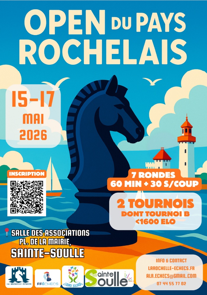 Championnat de Nouvelle Aquitaine des plus de cinquante ans : le week-end des 8, 9 et 10 mai 2026, en partenariat avec le GMI Mr Eric Prié, le club de Brive propose le 1er championnat de Nouvelle Aquitaine, homologué Fide à cadence lente, pour les joueur(euse)s agé(e)s de plus de 50 ans (catégorie "Seniors plus et vétérans").Afin de satisfaire aussi les plus jeunes, nous ouvrons deux tournois supplémentaire, fermés (A et B) de même cadence.Pour les non affiliés, la licence A obligatoire est délivrée sur place.Pour prendre connaissance des informations utiles et vous inscrire, veuillez scanner le QR code présent sur l'affiche du championnat.Le cas échéant, pour répondre à votre souhait d'hébergement à Brive, je vous propose (à prix modéré) l'hôtel Abelha Le France au 60 avenue Jean Jaurès 19100 Brive La Gaillarde. (En face de la Gare)L'hôtel est situé à 2,5 km du lieu du championnat, (Stade de la Garenne verte), soit environ 6 minutes en voiture..Avec le lien ci-dessous, vous aurez accès à une "visite visuelle gratuite" de l'établissement :www.abelha.frEmail : contact@abelha.fr (pour réservation)Le numéro de téléphone est : 05 18 10 20 30